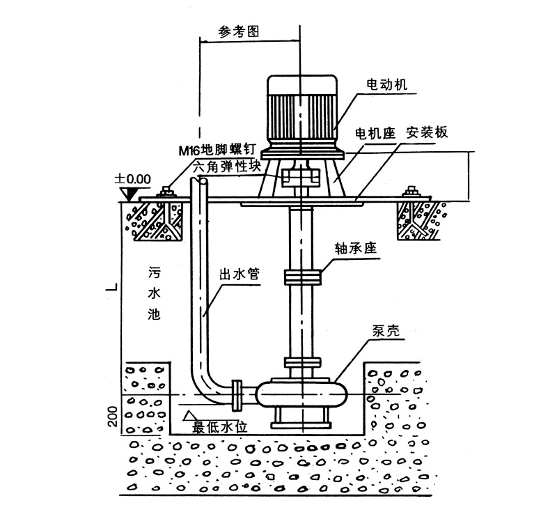 本泵系單級(jí)單吸立式離心泵,流體沿泵軸的軸線成70°方向流出,主要部件有蝸殼、葉輪、泵座、泵殼、支撐筒、電機(jī)座、電動(dòng)機(jī)等。蝸殼、泵座、電機(jī)座、葉輪螺母是生鐵鑄造,耐磨性、耐腐蝕性較好,加工工藝方便。 葉輪為三片單圓弦彎葉,選用半封閉葉輪,并采用可鍛鑄鐵所以強(qiáng)度高,耐腐蝕;加工方便,通過(guò)性好,效率高。 為了減輕重量和少車(chē)削量,泵軸是優(yōu)質(zhì)碳素鋼冷拉圓鋼制造。 泵座中裝有四只骨架油封和軸套,防止軸磨損,延長(zhǎng)軸的使用壽命。 本泵可垂直或傾斜使用,占地面積小,蝸殼需埋在工作介質(zhì)中工作,容易啟動(dòng),不需引水,旋轉(zhuǎn)方向應(yīng)從電機(jī)尾部看是順時(shí)針?lè)较蚬ぷ鳌?總機(jī)長(zhǎng)度備有各種規(guī)格,以便使用單位根據(jù)用途因地制宜地選用。